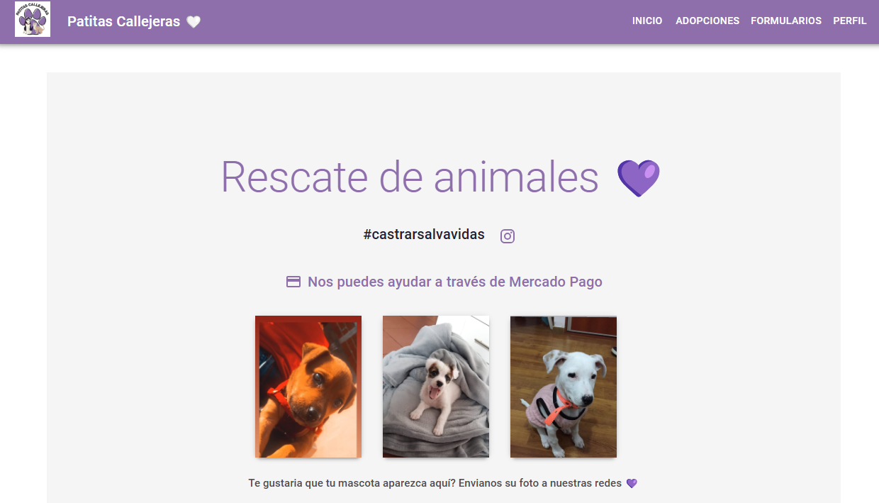 Aplicación web para el grupo de rescates "Patitas Callejeras" de Corrientes, Argentina . Permite a los usuarios completar el formulario de adopcion de mascotas e informarse de los casos actuales. Ademas cuenta con una sección para adminitrador donde puede gestionar los formularios de adopcion, cargar nuevos casos y ver el historial de casos resueltos. [React + Vite + Node.js + Firebase + Express + LottieFiles + Netlify]